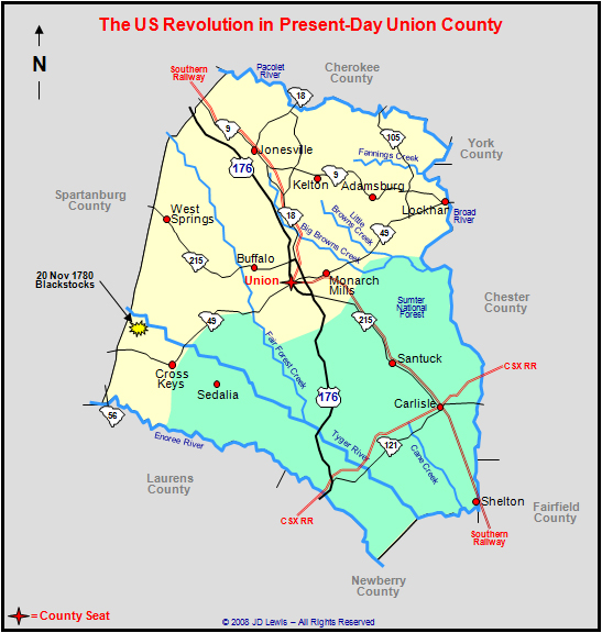 Gen Thomas SumterThe William Blackstock farm became the site of one of those "small" but violent clashes that made up the complex mosaic of the American Revolution in the South. The farm (several tobacco barns) sits just off the Tyger River, at the western edge of Union County, South Carolina. This backwater farm formed the backdrop to one of American General Thomas Sumter's most important battles. In November 1780, Georgia militia under Elijah Clark and John Twiggs reinforced Sumter, whose forces threatened Loyalist outposts north of the famed bastion at Ninety-Six. Sensing a threat to Ninety-Six could become untenable, the British commander in the south, Lord Cornwallis, ordered famed cavalry commander, Banastre Tarleton to break off contact with Francis (Swamp Fox) Marion's militia along the Pee Dee River. Tarleton rushed to his new assignment hoping to pin Sumter's force between him and the British at Ninety-Six. Fortunately, a British deserter gave warning to Sumter, who beat a hasty retreat out of the impending trap. Not to be outdone, the ever aggressive Tarleton pursued hell bent to get the rebel force before it could elude him. To do this, he led his cavalry, leaving infantry and guns to follow.