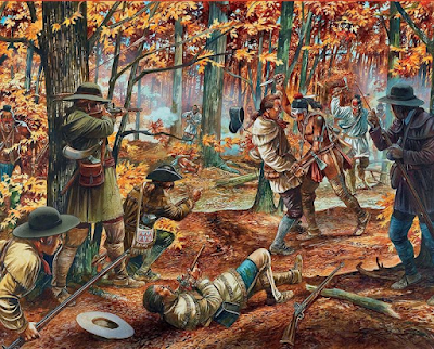 The way to Fort Duquesne was rough, but Morgan was more than up to guiding wagons pulled by horse teams through heavily wooded mountains, streams, and rivers of northwestern Virginia (today's West Virginia)), western Maryland, and Pennsylvania. Braddock's column was annihilated at The Battle of the Monongahela, where a smaller force of French and Indians cut the redcoats to ribbons in the dense forests around what is today's Pittsburgh.