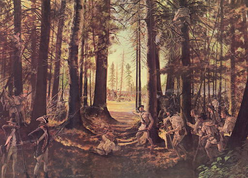 On 6 August, under a thick canopy of ancient woodland, they sprung a devastating ambush on the militia, which was halfway across a deep gulley. A terrific firefight ensued. Curtains of lead tore chunks of hardwood and scythed down brush and branches. Men fell on both sides, but with so many dead and wounded, including Herkimer, the Tryon County militia withdrew under cover of the dense gun smoke.