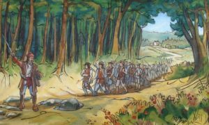 Following the fall of Fort Ticonderoga in the summer of 1777, the British General John Burgoyne forced the Continental troops to retreat. They pursued them through the dense, rugged woodlands east of the lakes. The Americans were able to make a fighting withdrawal, felling trees and setting up ambush points, and reconvene in a defensive perimeter near the last defensible position before the defile that led to the lowlands – Fort Ann. The British advance guard was on the move and intent on capturing the fort.