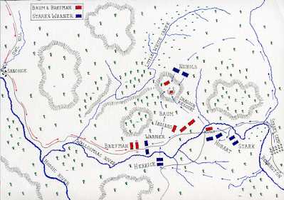 His jaw stiff with determination, Friedrich Baum rose to his feet and pointed his saber in the direction of the rebel fire. "The Iroquois must have fled. Why else would we receive rebel fire from there? Move a platoon to the south. Then bring up the cannon and quickly before they overrun us."