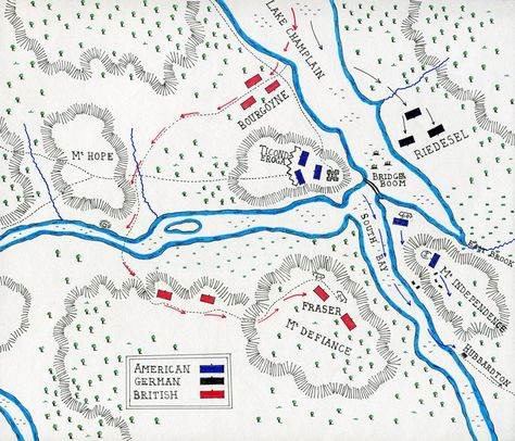 Brigadier General Fraser was put in command of Burgoyne’s advance guard, some 1,200 troops now trained as light infantry. The army launched itself from the mouth of the Richelieu River into Lake Champlain in an armada of Bateaux and canoes. Moving quickly, Fraser’s forces screened the advance on the impregnable Fort Ticonderoga and seized it in a coup de main as the American defenders retreated in the dark of night. Fraser himself led the troops and hoisted up a British flag.