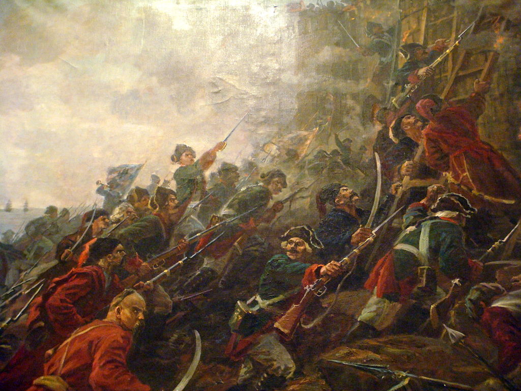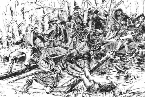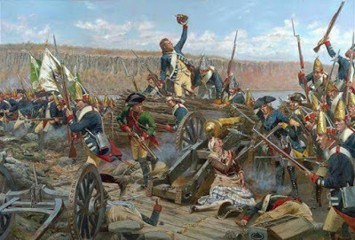 The Pennsylvania navy (yes, they had a navy) came to the aid of the forts guarding the Delaware approaches. Commodore John Hazelwood, with a sizable fleet of galleys, sloops and fire-vessels launched several raids on British positions on shore and constantly harassed British river operations while patrolling the waters around the fort. But British naval strength eventually held sway. Rebel resistance continued. Cold, ill and starving, the garrison, reduced to much less than 200 the original 400-450 men, refused to give up. Under the direction of French Major Francois de Fleury, an engineer of extraordinary energy, the Americans worked each night to repair the damage of the day. Fleury himself was wounded in the battle. A British ship of the line and sloop o' war both ran aground under the pummeling fire from Mifflin's defenders. But British naval superiority virtually guaranteed a bad outcome. Under cover of the murderous fire from the big guns of the floating battery, the British naval vessels closed in and soon British marines were sniping at the fort from high up in the rigging. With almost all their guns knocked out of action, the Americans were running out of options - but not out of gumption.