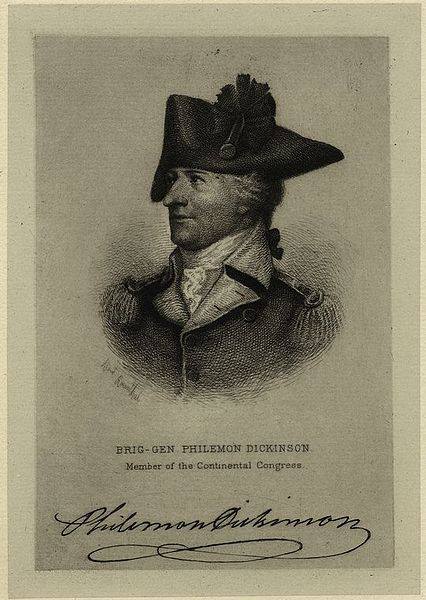With a family caught up in revolutionary politics, it was natural that Philemon would eventually play a role along with big brother John. In 1775 he was offered a colonelcy in the Hunterdon County militia. This first patriot quickly accepted. By October the following year he had risen to the rank of brigadier general – he also held a seat in the state’s provincial congress. During the Continental Army’s retreat across the Jerseys in 1776, Dickinson proved a valuable asset to the beleaguered George Washington. Dickinson’s performance under fire at Trenton in December 1776 was most noteworthy. There the sturdy militia general ordered his own home shelled in the heat of battle after he learned it was an enemy command post!