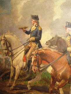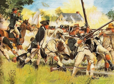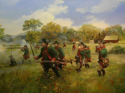 Hanger's German contacts served him well, however, and he soon received a captain's commission in the Feldjager Korps of the forces of the Landgraf (Elector )of Hesse-Kassel, another elite unit. I think we know where this is going... It was as part of this band of young teutonic aristocrats that Hanger sailed for America when the Landgraf "rented" his troops to King George III. Leaving Portsmouth in March 1776, young Hanger would arrive in time for some of the most "fun" episodes for crown forces during the entire eight year struggle. He played a role in the juggernaut campaigns that swept the rebels from New York and the Jerseys in 1776. And in the less glamorous but no less savage escapades of 1777. His performance was such that he assumed command of an elite Hessian Jaeger (light infantry) company drawn from all the Hessian regiments of the army. By all accounts, Hanger distinguished himself in the months that followed. His unit did more than its share of screening, patrolling and small scale fighting in the area around the Kingsbridge, Spuyten Duyvil and Westchester. Around this time he learned that his estate in Britain had gone into foreclosure, and through a series of misfortunes, he was worse than broke. Our young hero had become a self-styled "soldier of fortune."