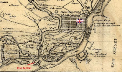 John MontressorGeneral Howe ordered a move on nearby Providence Island on 10 October, 1777. Washington's land forces resisted, but were quickly driven off and soon heavy siege guns were set into battery facing the American fort. Formidible as it was, Fort Mifflin had not been heavily fortified for a threat from Philadelphia. In no small bit of irony, Captain John Montresor, earlier designer and builder Fort Mifflin, planned and built the siege works used against his fort. Things were certainly stacked against the rebels. Soon, heavy balls came crashing into the American positions. The pounding against that side of the fort was horrific, but the American fought back gallantly, inflicting heavy damage on several British ships that tried to force their way up river. The British mounted guns on floats, forming water batteries that edged closer to the beleaguered outpost. American casualties mounted and supplies dwindled over the month of horrific bombardment and deprivation.