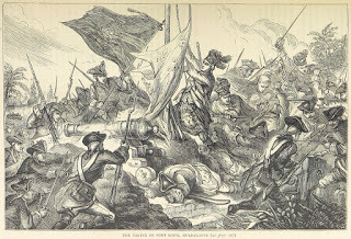 so named for a swarthy complexionBut Billie Howe's brother, "Black Dick", would have the last say. He was finally able to unleash the Royal Navy. On 10 November, a floating battery of twenty-two heavy 24-pound guns closed to within 40 yards of the fort. At point blank range, the British gunners could have their way, big time. This turned out to be the heaviest bombardment of the Revolutionary War. Shot and shell pounded walls and buildings to pieces. Defenders had limbs torn away or crushed. The battle was tilting toward the besiegers but Smith and the defenders were determined to defend the fort. The cold weather was coming early and if they could hold