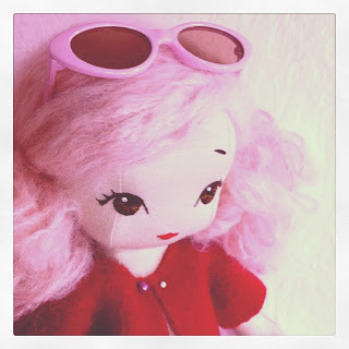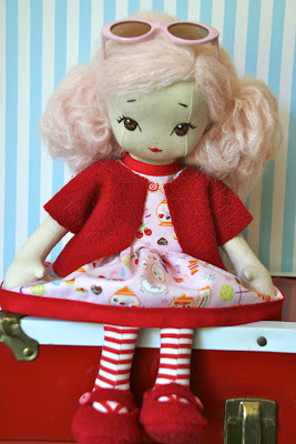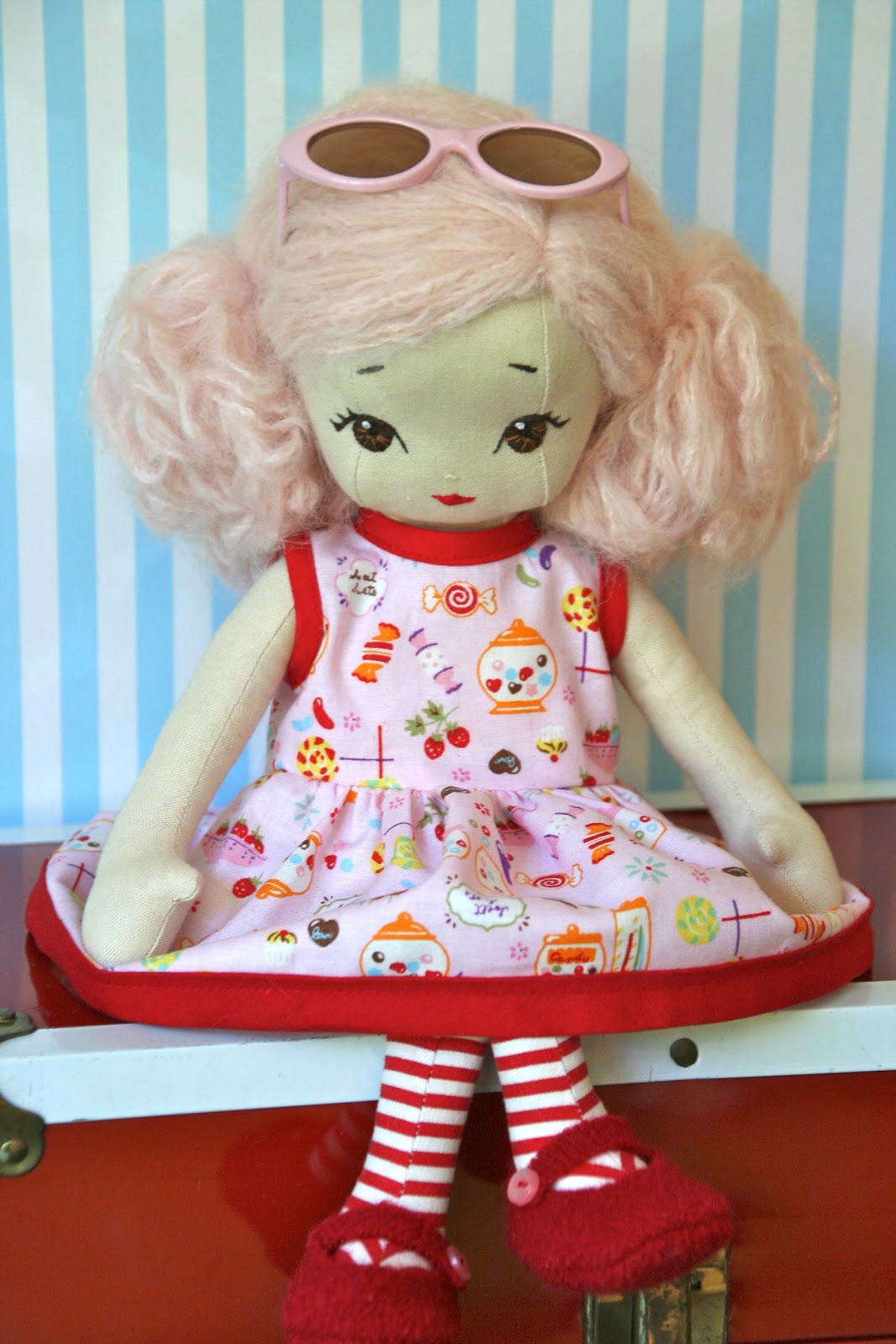 After weeks of procrastinating, I finally finished this little 12 inch doll for my youngest daughter. My youngest likes candy and the color pink - hence the hair and fabric choice for the dress (both her picks).