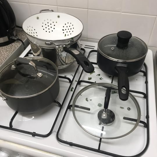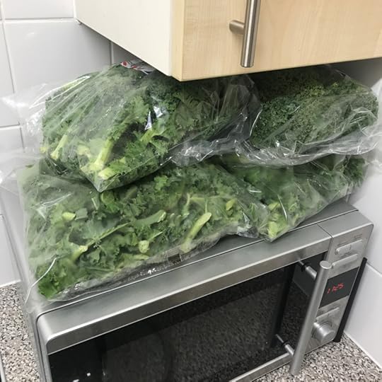 Boil some water in a large pan. You don’t need much water because the kale leaves will shrink.Add handfuls of kale (chopped) to the boiling water.Cook (blanche) for two minutes. Maybe set a timer.Prepare another saucepan with ice cold water.After two minutes cooking, drain the pan with the kale under a cold tap and add the kale to the icy water. This will have the effect of stopping the kale from cooking any further, which is what we want.Place a towel on the work surface, then put handfuls of kale onto the towel, then roll the kale up in the towel to get rid of as much moisture as possible.Separate out the kale and freeze in freezer bags (write the date on the bags for reference if possible!)Here’s what my cooker looked like when I finished the process: