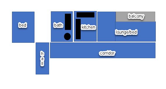 A crappy floorplan I made so I could get things straight in my own head - I’m guessing the white space next to the hall would be where Ben’s mum’s room was. No idea why I didn’t actually put that on the plan, while I very deliberately put the kitchen counters and the bath and toilet.