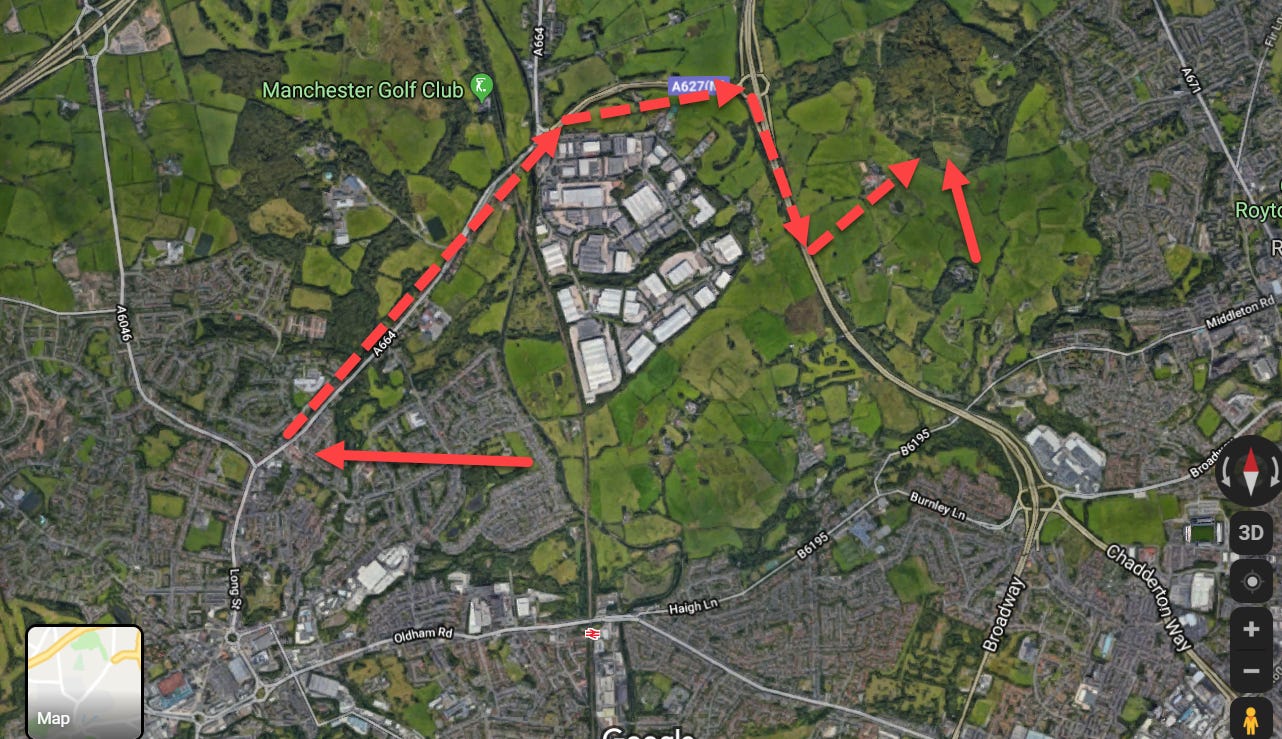 And if you follow the map for his journey on the cherry picker then it means that the exercise field that Brown gets trapped at is somewhere hear in Tandle Hill Country Park. I think I need to go for a walk there sometime and see if I can figure out precisely where it would be.
