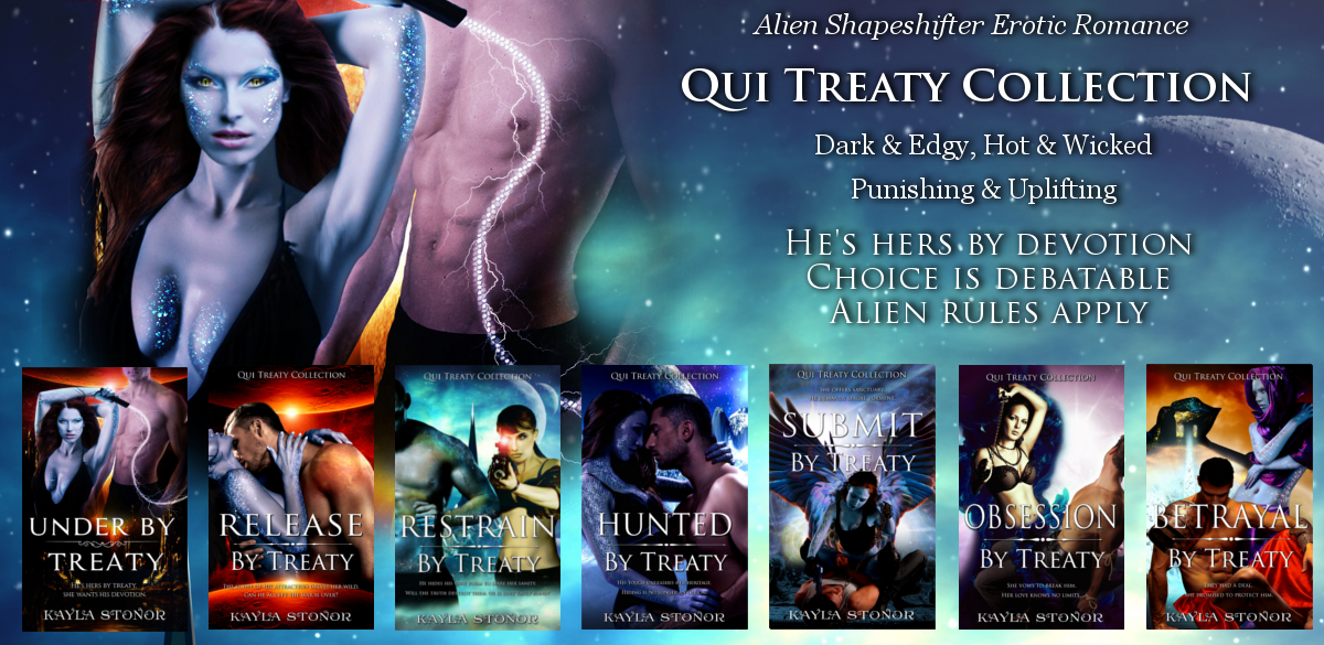 Now available in one box set, THE QUI TREATY COLLECTION by Kayla Stonor! http://smarturl.it/QuiCollectionAlien Abduction RomanceMilitary ScifiGalatic Space OperaBDSM RomanceAlien Shapeshifter Romance