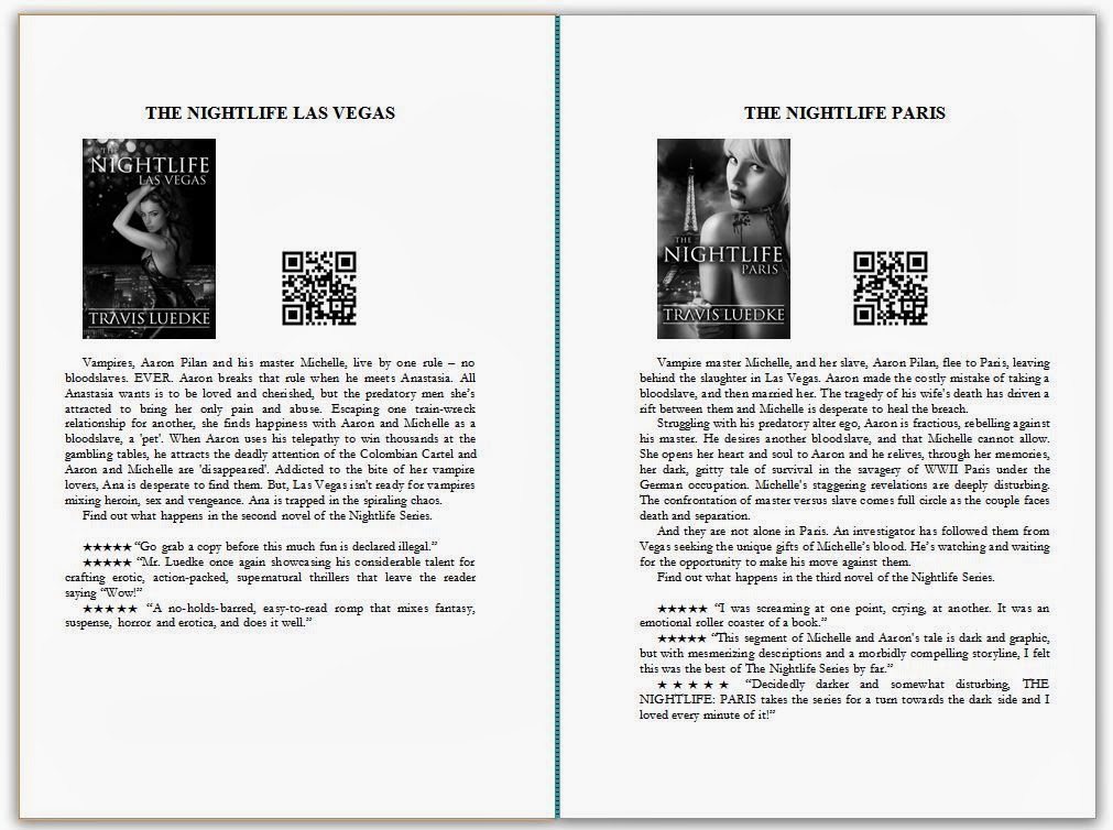 B&W book covers, with QR codes, descriptions, and review quotes.► Print back matter and front matter is always going to be a different format and content from ebook front and back matter. Personally, I have separate word files for both back and front print matter, (that's the way I do it, but its not the only way, and it has issues with formatting that I learned to deal with). But, because of these differences, its really not wise to use a print formatted file for ebook, or vice versa.Now, I am just an Indie author, busting my butt to navigate the labyrinth of digital publishing, but, I have seen that my own sales are about 99% ebook, and about 1% print.