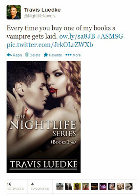 I know what you’re thinking. “What’s the point? Other indie authors don’t want to buy your books. You’re just spamming each other. It’s just a huge circle jerk.” And you’re right. The people who follow me are not my target audience at all. Neither are most of the people who follow them, because we’re all pretty much just following each other. But “most” is the operative word there. For every person with tens of thousands of who retweets one of my tweets (my soul dies just a little bit more every time I say that word), I might reach a few hundred new potential readers. My followers, the whores and spammers, know this, which is why they continue to suffer through my bullshit, and spam it out to their own followers.
