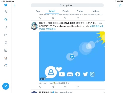 For the last week, the results of my regular searches for mentions of ‘Thucydides’ – mainly but not solely for the purpose of correcting misattributions and misquotations – has been dominated by a lot of very similar and very puzzling tweets, along these lines: fragments of unknown text mentioning Thucydides but not actually making any sense, with the main event being short videos that simply flash up incomprehensible phrases.