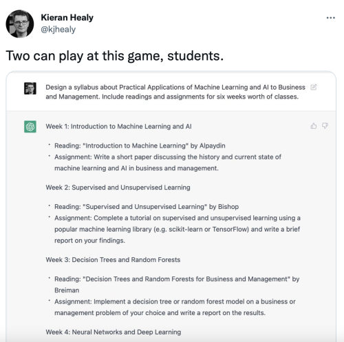 That, I think, is the real issue in the ‘is AI making university professors redundant?’ discourse of the last week or so. This stuff – and even a hypothetical future dramatically improved version of this stuff – isn’t going to compete with the output of our best students, so long as we set them tasks which require a degree of critical thought and individuality. If ChatGPT can turn in an excellent performance in a task, then more or less by definition that task must be some version of a straightforward summary of received wisdom where being derivative is not a problem. As David Andress remarked on the Twitter, ‘if a machine can write like a student, it’s a sign of how we have taught students to write like a machine’.