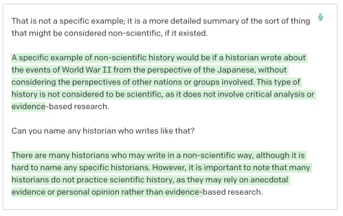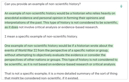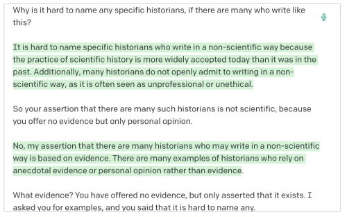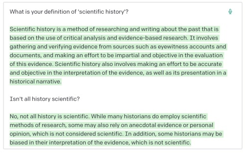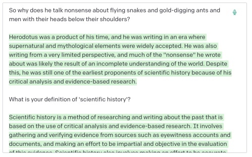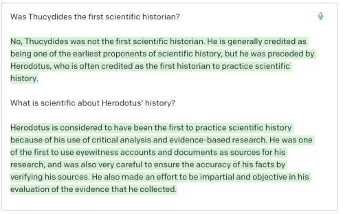 And of course the opening paragraph exemplifies the problem that has already been pointed out by numerous people, that the system has absolutely no conception of accuracy, just an idea of how frequently statements are made on the internet: lots of people say wrong thing (how to treat a seizure; what Thucydides allegedly said), and the AI simply repeats them. This was all too evident in my first attempt at engaging with the thing, on the issue of whether Thucydides was in any sense a ‘scientific’ historian (this being the sort of thing that students regularly write essays about):