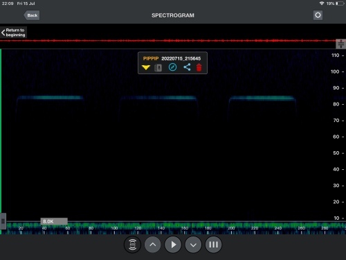 One of my lockdown investments – probably the second-best one after the new pond (which is looking rather sorry for itself at the moment – but water is still clear, what’s left of it, and there are still lots of mating dragonflies) – was a bat detector. We get lots of bats flying over the garden, but had no idea what they were – basically, due to combination of smallness, speed and darkness it’s pretty well impossible to identify bats visually beyond ‘some sort of pipistrelle’ (very small, fluttery) and ‘maybe a serotine’ (bigger, more swooping). The answer is some sort of ultrasound detector, as all the different species have distinctive echolocation and social calls; there are gadgets that allow you to listen (is it a rapid peep-peep-peep or a slower pwoop pwoop?), and fancy expensive gadgets that plug into a tablet to give you a visual representation of frequency range and ‘shape’, and then the software offers its best guess.