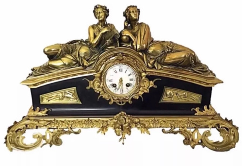 Ornate cast metal desk clock with balance wheel escapement mechanism, made in 1908 by Japy Frères of Paris, yours for £2995 from Spencelayhs Antiques, to whom I am very grateful for permission to use these pictures. Why am I bothering to post this here? Because those aren’t just any old nymphs on the top; the one on the left is undoubtedly Clio, muse of history, as is made very clear by the scroll she’s reading…