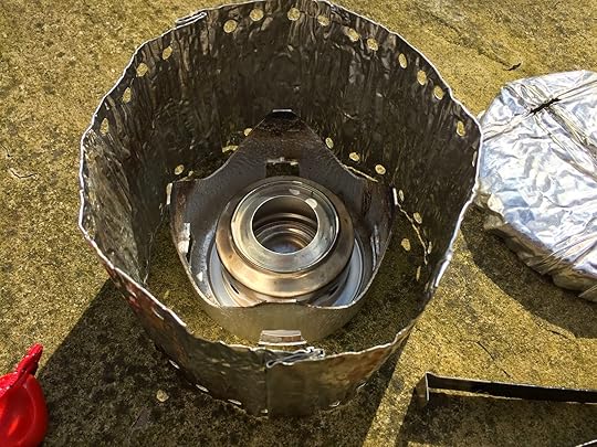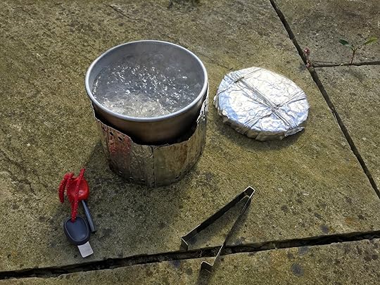 Where it differs is the burner. The old Trangia burner weighed over 100g and was never particularly efficient, but I've replaced it with a Trail Designs 12-10 burner weighing only 16g. It's a similar idea to the Trangia burner — you measure out some fuel, which sits in the central reservoir and burns until it's used up — but far simpler and made from recycled aluminium cans. It's also much more efficient than my old Trangia burner, and can keep water boiling for longer on the same amount of fuel.