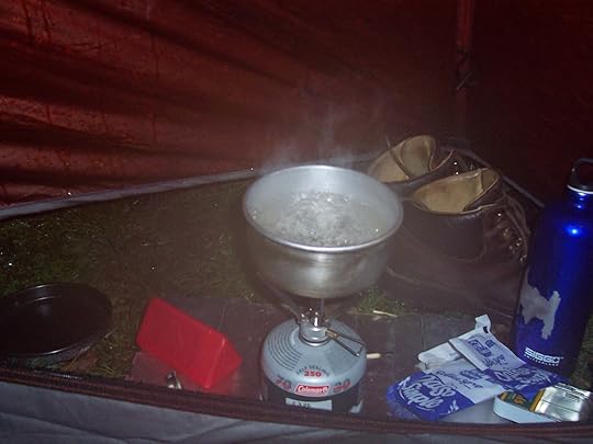 5. Canister stoves are not very stable. If using one in your tent vestibule (which you shouldn't really do, but I've done it hundreds of times) there is always the risk of knocking the whole setup over — at which point liquid fuel sprays from the nozzle and ignites at high velocity! This has happened to me once before, but fortunately I was able to put out the blaze before it spread to the tent fabric. Remote-canister stoves are available, but there is usually a weight penalty.