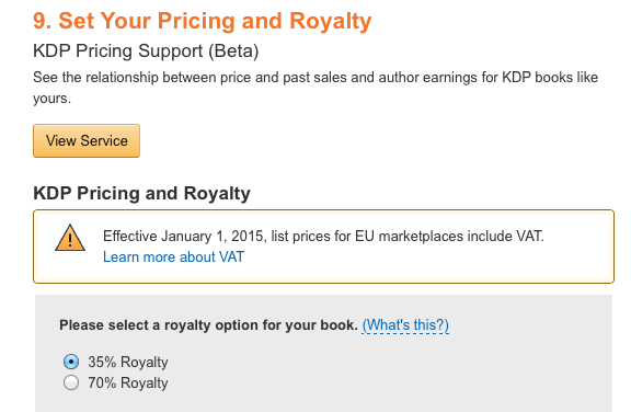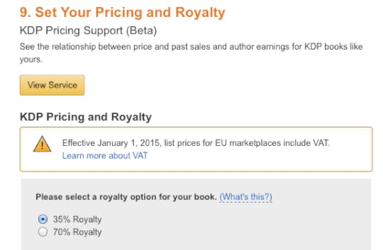 The new VAT panel on the KDP dashboardIt’s actually much easier to use now. Rather than having to figure out the VAT-exclusive price from your desired list price, you just enter your list price and the system automatically deducts VAT. For example, if I want my book to sell for £1.99 then I simply type in £1.99. It ought to have worked like this from the beginning.The problem, of course, is that VAT is now 20%. Amazon won’t absorb that price. You have a choice: you can either make your readers pay it, or you can pay it yourself. Put another way, if you continue to sell your £1.99 ebook for £1.99 you will make less money for every sale.