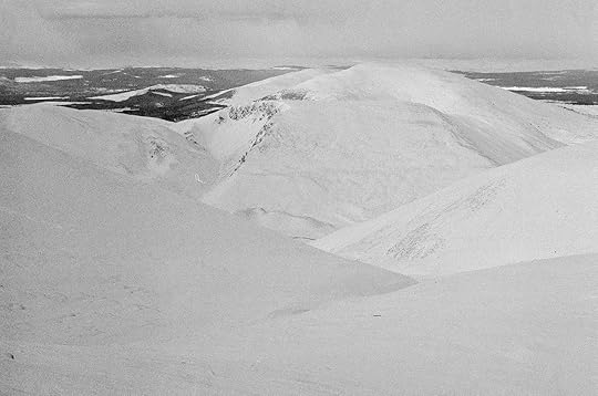 A sombre day for Bynack MoreViews were misty and I didn't see the bulk of Bynack More until reaching the footbridge. The mountain looked completely white.I kept plodding through the snow. It's a very easy ascent, possibly one of the easiest Munros I've done. The initial ascent follows a gentle path up an easy spur of land, browsed by grouse. I could see black tufts of exposed heather where the grouse had been digging for fresh shoots. Of course, the conditions made the going much more difficult than it would be in summer, and everything was pretty well drifted over. I couldn't see the path for most of the way (not that following the path was at all necessary on that kind of terrain).
