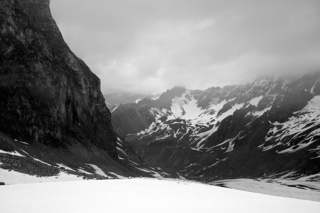 After digging the tent outAlone on a glacier at over 3000m and in dreadful conditions, I knew I had to get out of there pretty quickly! I struck camp in ten minutes flat and began the descent to the Haut Glacier d'Arolla in poor visibility. The fresh snow also made the going treacherous, balling up under my feet, but crampons were necessary due to the patches of bare ice on the slope.