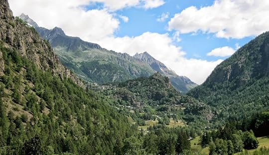 Typical Val Pelline terrain. The village centre frame is Oyace.At this point mountains of considerable height hugged the valley on both sides, but no glaciers were in evidence and little snow. Forests of larch and pine predominated, and the communities were generally agricultural and deeply traditional. In 1842 Italy as we know it today did not exist; this region belonged to the territory of Piedmont, part of the Kingdom of Sardinia.Bionaz