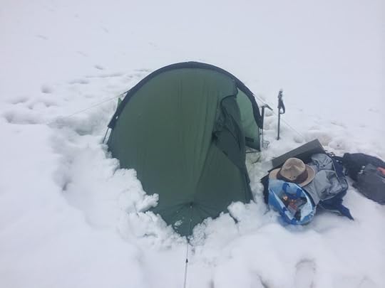 When I woke at 3am, I looked out of the tent and saw that the clag had come in fast, so I went straight back to sleep, not waking again until 7. However, between 3 and 7 quite a lot of snow fell (about 6 inches altogether) and when I awoke the second time my tent was almost buried in it. Visibility had reduced to about twenty feet.
