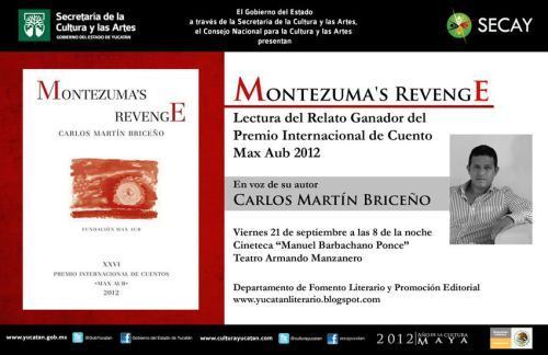 Leí por primera vez Montezuma´s Revenge una madrugada de insomnio lacerante. Desde sus primeras páginas fui presa de súbitos ataques de risa que aligeraron mis preocupaciones y despertaron a mi mujer sin proponérmelo. Una tarde de hace pocos días, en circunstancias normales de descanso, emprendí una segunda lectura que me provocó la misma reacción haciéndome despanzurrar a carcajadas. Y eso que no se trata de un texto humorístico, o no solamente humorístico. Hay algo en este magnífico relato de Carlos Martín Briceño, justo vencedor del prestigioso XXVI Premio Internacional de Cuentos Max Aub 2012, que podemos identificar pero que, al mismo tiempo, se nos escapa. Trato de explicarme: a primera vista, nos encontramos ante un relato lineal de engañosa simplicidad que podría asociarse, por su tratamiento, temática y la psicología del personaje, a diversas creaciones de autores cultivadores del realismo que ahondan en las miserias de los hombres y en su dificultad —cuando no imposibilidad— de relacionarse. Permítaseme traer a colación a Raymond Carver o a Charles Bukowski. Pero esos dos componentes argumentales, el egoísmo invencible del protagonista (de quien nunca sabemos su nombre), y el sarcasmo cínico con que se conduce y expresa sin importarle a quién haya que atropellar, son desarrollados por Carlos en el marco de una vertiginosa trama de carácter policial que hace constantes guiños a la novela y cine negros. “Estoy convencido de que toda felicidad nos cuesta muertos”, declara el inmerecido y sinvergüenza héroe. No en balde Carlos Martín ha sido un voraz lector en su temprana juventud de Agatha Christie, y de sus mejores herederos más tarde, como él mismo ha confesado en numerosas y agradables charlas. Como sea, la alquimia narrativa con que ha fabricado Montezuma´s Revenge se traduce en un texto eficaz, divertidísimo y de lo más original. Y quiero insistir en la idea: al ser original, hay algo por fuerza, felizmente, que se nos escapa al intentar definirlo.