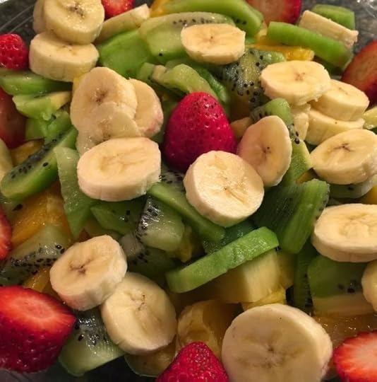 Kiwi, banana, pineapple, mango, orange segments with a smattering of out-of-season-and-therefore-shitty strawberries.