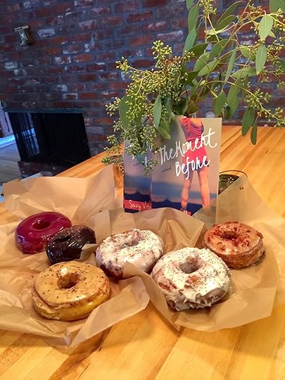 My buddy Tom Spanbauer and me!As lovely as the "magic is in the hole" doughnuts are, on my book birthday, I thought I'd amend my plan to eat cleanly all month and celebrate by buying an array of fabulous confections, and just sample a bite of each. Variety being the spice of life and all. But instead of Voodoo, I bought this six-pack of donuts at Blue Star. Why not spread the wealth (and the calories, and the fat)?Whereas Voodoo is clever and edgy, Blue Star is foodie and gourmet. And a bit more expensive. Their brand is quality forward, as opposed to Voodoo's hipster grunge. Watch the Cooking Channel video above if you want to have a foodgasm. Truly.