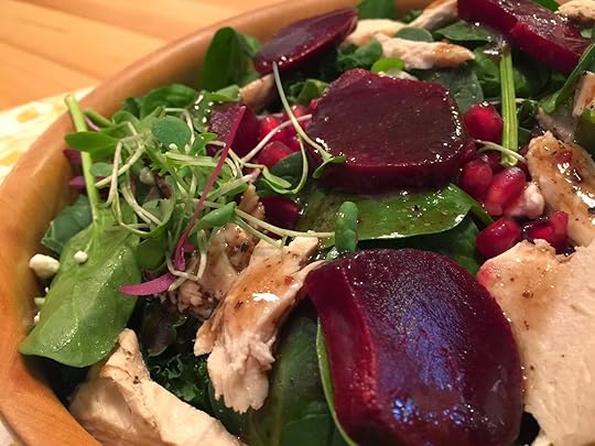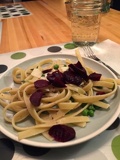 Lunch - Power salad - again tapping into the convenience of TJ - Kale, microgreens, baby spinach, beets, ready-to-eat pom seeds, 2 ounces fully-cooked grilled chicken breast strips, a half-ounce of crumbled goat cheese, a Tablespoon of balsamic vinaigrette. So good! 200 calories.Dinner - Looking pretty on a plate of fettuccine (I scraped the Alfredo sauce off in favor of a half tsp butter and a sprinkle of parm cheese). A bit more caloric, this dish. 450 calories, but super filling.