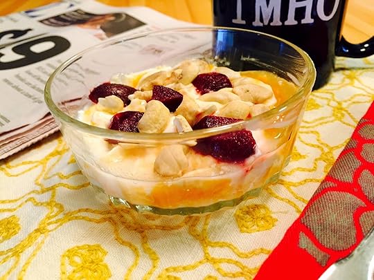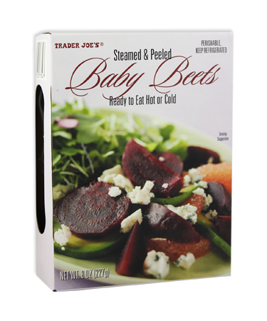 Speaking of easy, today, I want to talk about a product that takes the mess out of one of my favorite nutritionally sound foods. Trader Joe's Baby Beets. They're in the veggie section, cooked/peeled, ready-to-eat and super low in calories, high in nutrition. (I sound like an infomercial, I know...)Lest you think that they're only palatable when paired with a half-pound of chevre, here's how I consumed them over the past 24 hours: