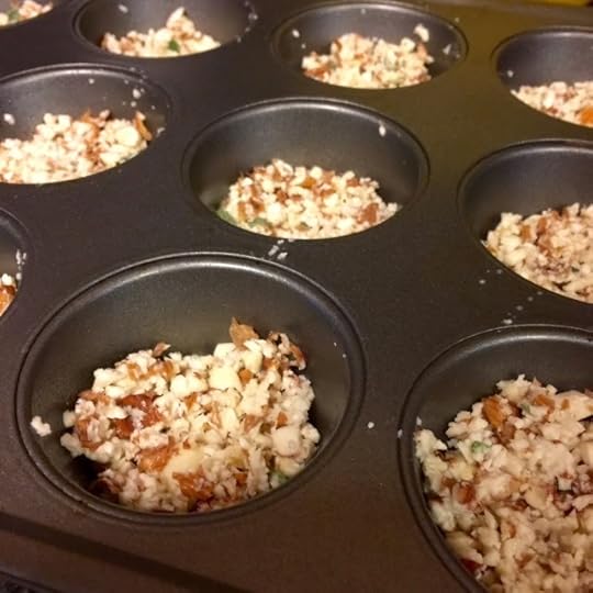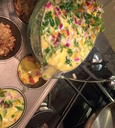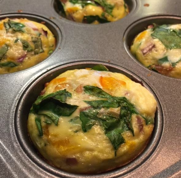 Vegetable Filling: 5 large eggs (or 6 medium), whisked 3/4 cups unsweetened almond milk 1/2 cup feta (or ricotta) cheese 1 cup Swiss chard, rinsed and chopped 1/3 cup orange pepper (or other sweet peppers) 2 tablespoons red onion, chopped 3 garlic cloves, pressed or minced pinch salt 1 tablespoon fresh basil, chopped grated nutmeg (optional) Preheat oven to 400ºF. Grease a 12-cup muffin pan or line it with silicone baking cups.In a medium-sized bowl, mix together all the ingredients for the crust until you get a wet, crumbly dough.Divide the dough evenly among the 12 muffin cups, and press the dough firmly into the bottom of each cup.Bake the dough for about 10-12 minutes, until the edges of the dough start to brown.While the dough is baking, mix all the ingredients for the filling in a medium-sized bowl.Once the quiche crusts have been baked, remove them from the oven and reduce the heat down to 375ºF.Pour the filling evenly onto the baked crusts.Bake for about 20-25 minutes, or until the eggs are cooked and the filling is firm to touch.Let the quiches cool before removing them from the muffin pan to ensure that the crust does not crumble. Grate fresh nutmeg over them.