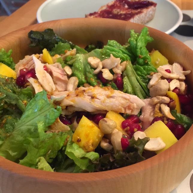Rotisserie/lettuce/pom-mango-cashew Salad2 – 3 oz rotisserie chicken breast meat3 fistfuls of lettuce¼ cup chopped mango2 Tablespoons pom seeds2 Tablespoons chopped cashews1 ½ Tablespoons Suzy’s Salad Dressing (60 calories)