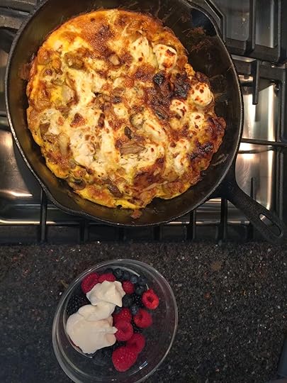 I made this omelette for the fam yesterday, and it mostly got eaten up (there's still a sliver left - I may sneak it into something later). Actually, it was a frittata, not an omelette, because it was puffier and broiled at the end. Here's the recipe - try it tomorrow with breakfast:HOT WHITE FOOD FRITTATA:ingredients:half an onion, chopped1/2 cup sliced mushrooms1/2 cup diced cauliflower3 ounces feta cheese6 eggs1 Tbsp curry spice (good for blood pressure)1 Tbsp olive oil