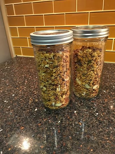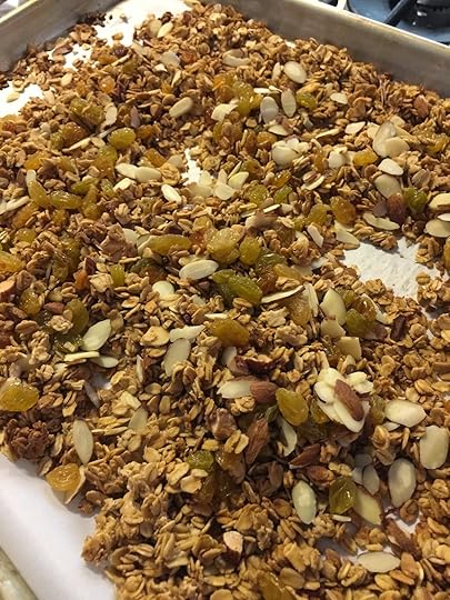 Preheat oven to 300Measure oats and almonds into a large bowl Mix the wet ingredients in small bowlCoat the oats and almonds with mixtureSpread the coated oats and almonds on a cookie sheet (tip: parchment paper makes it less messy and easier to pour into jars.)sprinkle cinnamon over the oatsBake for about 20 minutes. Watch closely, and occasionally stir the outer oats into the center (outer oats will brown faster)Take out, let cool, mix in the drained raisins Once cool, pour into fancy jars that look nice on your shelf! (Or any container, really, I'm just getting a little Martha on y'all.)