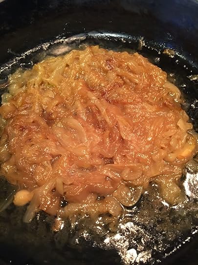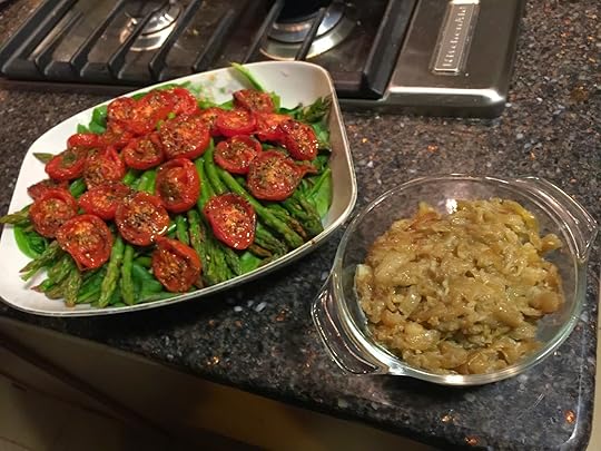 Directions:Caramelize onions for an hour in olive oil according to these directions. (Sorry, but it does take time).Meanwhile, drizzle herbed tomatoes in 2 Tbsp olive oil and roast in 375 oven until brown (about 15 minutes)Steam baby asparagus for 2 minutes, then coolSqueeze lemon over asparagusArrange greens on serving platter and drizzle with half the balsamic vinegar Assemble the project attractively, add the rest of the vinegar, but keep the caramelized onions separate until ready to serve. Heat the onions once more before placing on top of prepared dish and serve.