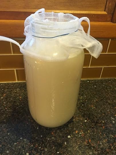 Next step is, rinse them and then blend them up with water and a half tsp or so of vanilla, maybe a few dates if you want to sweeten it a little. 4-1 water/nuts. Then, get out your giant mason jar, fit the nut sac inside of it. Fasten a rubber band around the rim, and pour your concoction in the bag.