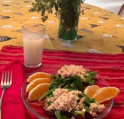 LUNCHThe dreaded one-slice, open faced tuna sandwichNavel orange or other fruitAlmond (or cashew) milk