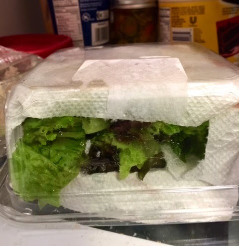Oh - and the lettuce thing. The husband came up with this cool idea for boxed lettuce. A sheet of paper towel on the top, then flip it over for storage. Our lettuce lasted all week. As for the heads of lettuce - I saved the container and washed/tore/dried the lettuce and stored it in the recycled paper towel-lined lettuce box.