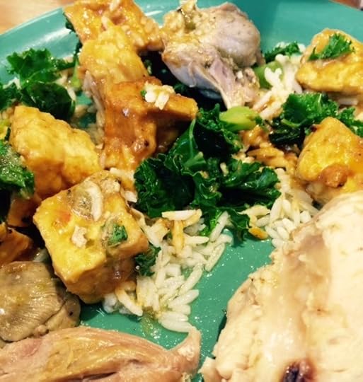 · ½ c basmati rice· 3 oz stewed chicken verde w/ extra verde sauce· 2 scoops baked tofu· 2 scoops raw kale