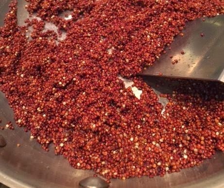 pan-toasting quinoaQuinoa Corn Kale Fritter Cakes (makes 4 servings)¾ c quinoa (toasted for 5 minutes in 1 Tablespoon canola oil)1 ½ c water½ cup frozen corn1 cup kale (chopped)2 Tablespoons minced minced onions2 eggs (beaten to within an inch of their lives)¼ cup buckwheat or other flour½ cup green onions, chopped ½ tsp white pepper1 tsp saltCanola oil as neededAdd the water to the toasted quinoa, bring to boil, cover and simmer 12 minutesTransfer to large bowl and mix in frozen corn to coolMeanwhile, blend the kale and minced onions in a food processor (or immersion blender)Mix blended stuff with eggs and flour and salt/pepperCombine with quinoa mixture and make the batterThese should resemble fritter/pancakes when you fry them.Tuna Steak seared two waysIt’s Jamie Oliver!
