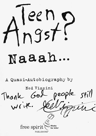 But when I started writing YA, I shifted my surveillance, and began nosing around the end of the alphabet in kid lit. And that's when I discovered Ned Vizzini. Vizzini! A YA paisan, I thought. The Italian last name. The teen angst themes. I brought It's Kind of a Funny Story home for Carson. And the Teen Angst book, too. He particularly took to Teen Angst, because he was doing an autobiography unit at school. Turned out, though, I had to go to bat in my son's behalf when his 7th grade language arts teacher declared he couldn't read it for credit.