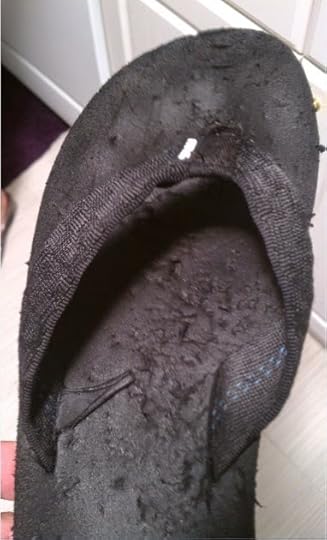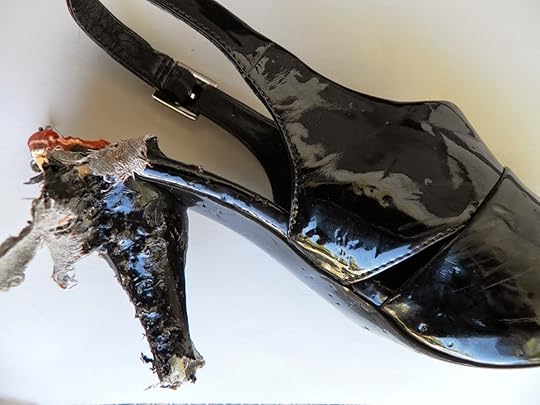 An hour later, we found this on the floor. Naturally I confronted Nikki, my Doberman puppy, to see if she had any knowledge about the condition of the previously unscathed shoes. She denied everything! She claimed she had never seen them before! She said they were always like that, and we should look into complaining to the manufacturer. She has an honest face, so I know I can trust her...but the mystery still remains as to how the shoes got this way.