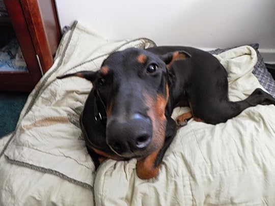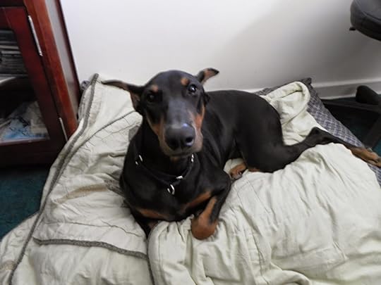 Art Van used to lie to me this way, so after it happened I was very, very suspicious. I have a relatively new puppy. When I was writing GOD Stole My Daughter, this young dog provided little assistance. Nikki is six months old and weighs about 60 pounds.