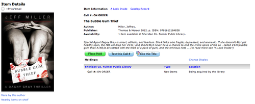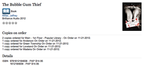This is not to take anything away from the Sheridan County Fulmer Public Library, which I will always love, but my hometown library—the Public Library of Cincinnati and Hamilton County—has apparently ordered several copies of The Bubble Gum Thief, including one that is to reside at a branch just two and a half miles from where I live.