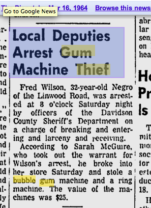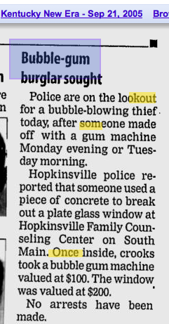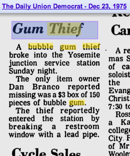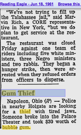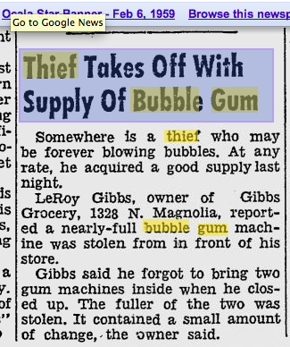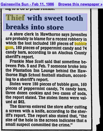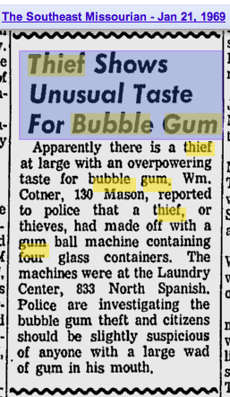 More articles about bubble gum thieves. Again, my guy is much more dangerous than these. Click on each to see the full image.